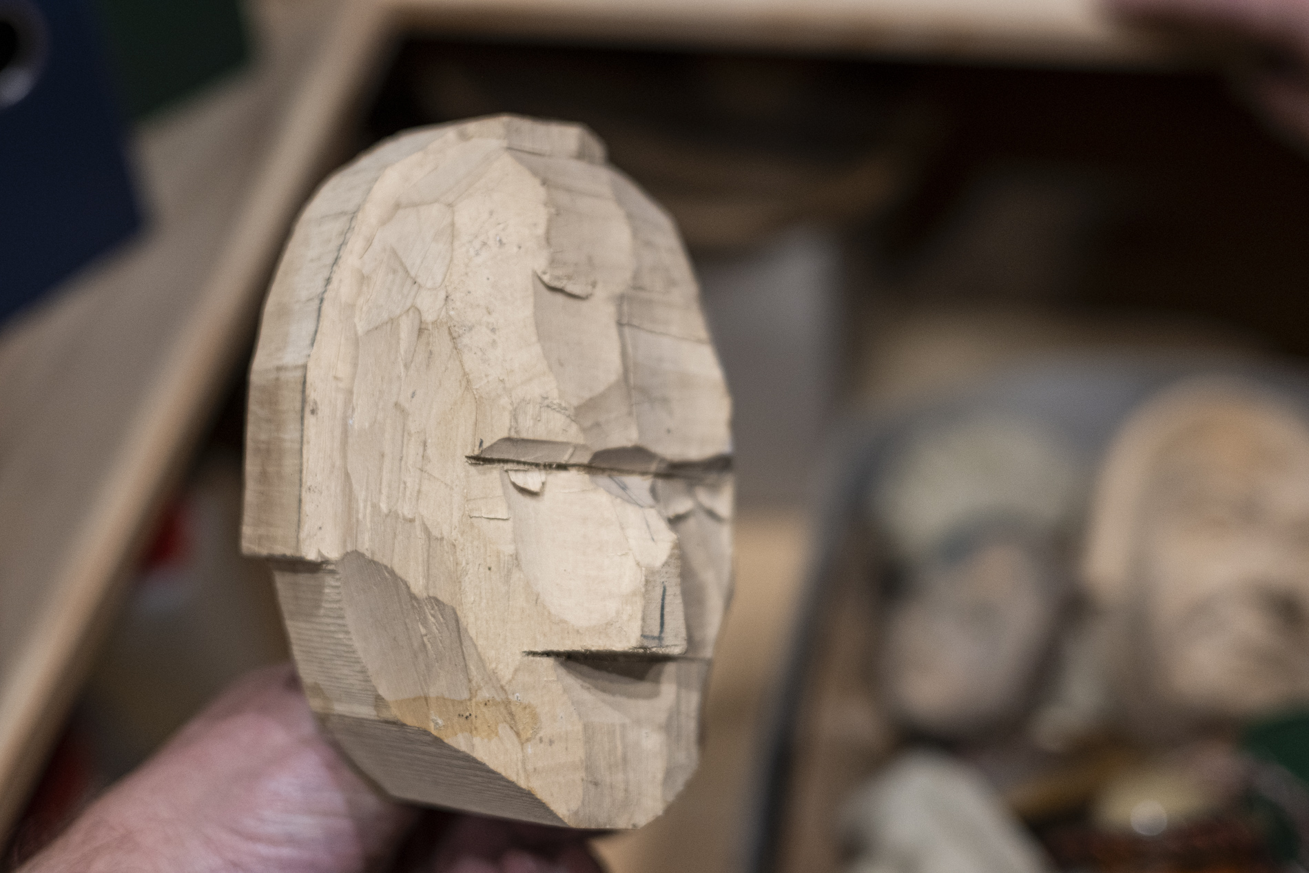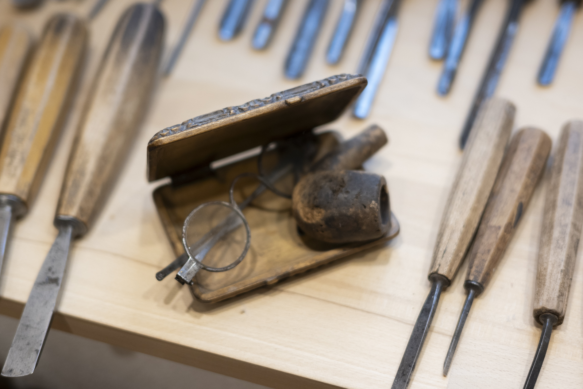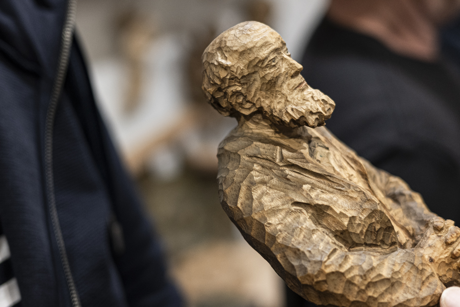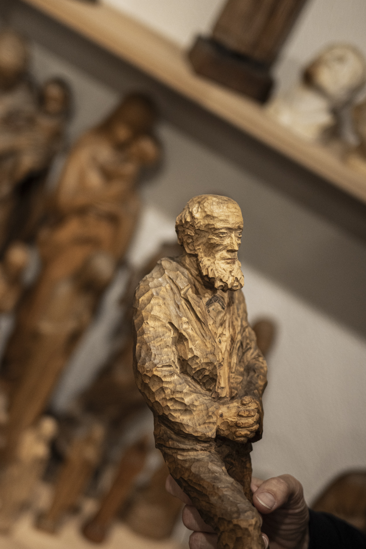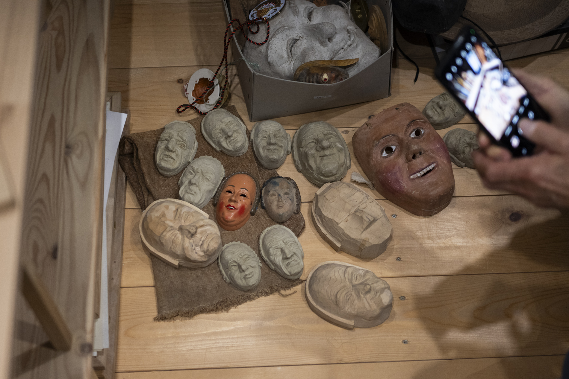 Wir durften das Museum besichtigen und viele Arbeiten von Otmar bewundern. Auch die beiden ersten „Masken“ aus ganz frühen Jahren waren noch da. Kittel und Baskenmützen hingen am Haken, als wäre Otmar erst vorhin aus der Werkstatt gekommen. Beitel und Späne auf dem Boden zeigten die Ecke, in der er am liebsten geschnitzt hat. Eine kleine Zeitreise also – mit einer großen Hommage.